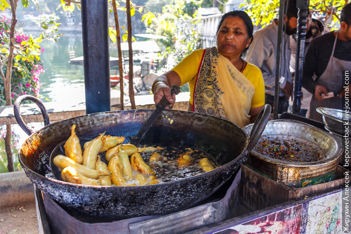 На каждому углу индийских городков что-то готовят, но условия, в которых это делается, совсем не внушают доверия. Местные привыкшие и с удовольствием это едят, но я бы посоветовал использовать нормальные кафе и рестораны, где обычно сидит много людей.