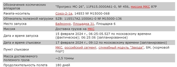 Ракета «Союз-2-1а» с грузовым кораблем «Прогресс МС-26» стартовала с площадки 6 на площадке 31 на Байконуре 15 февраля 2024 года в 06:25:05.527 по московскому времени.