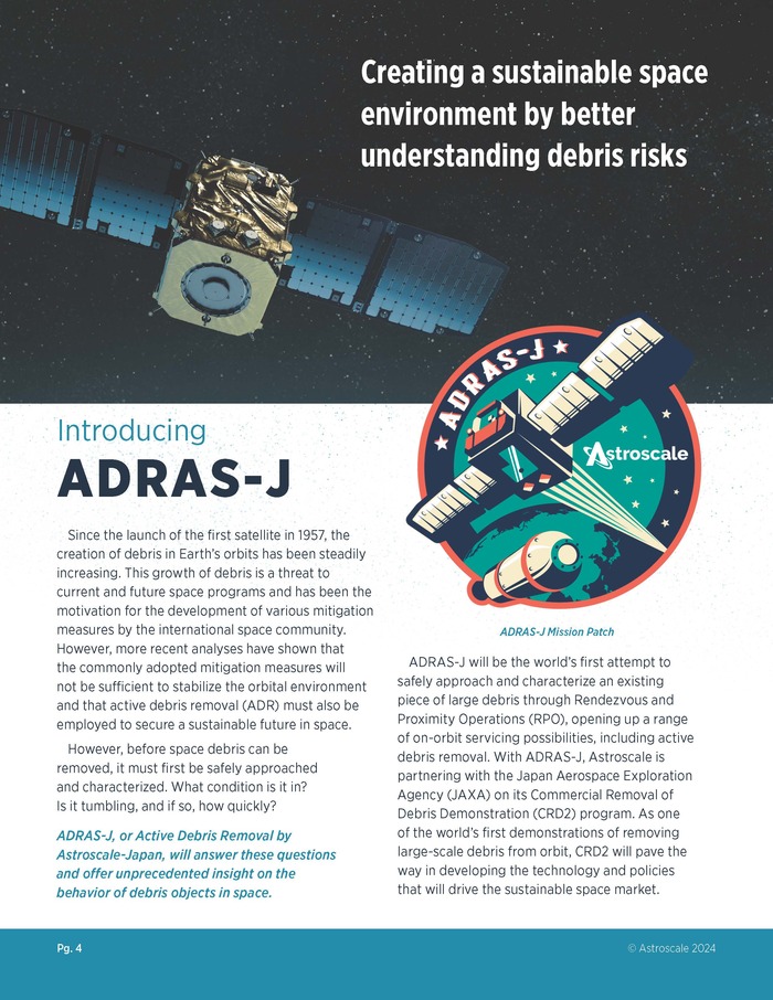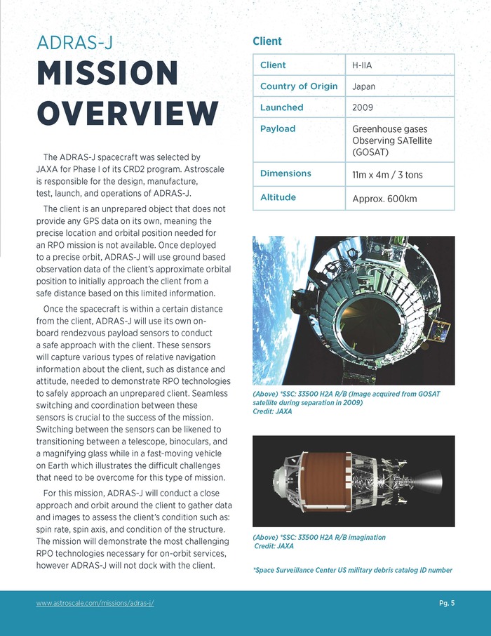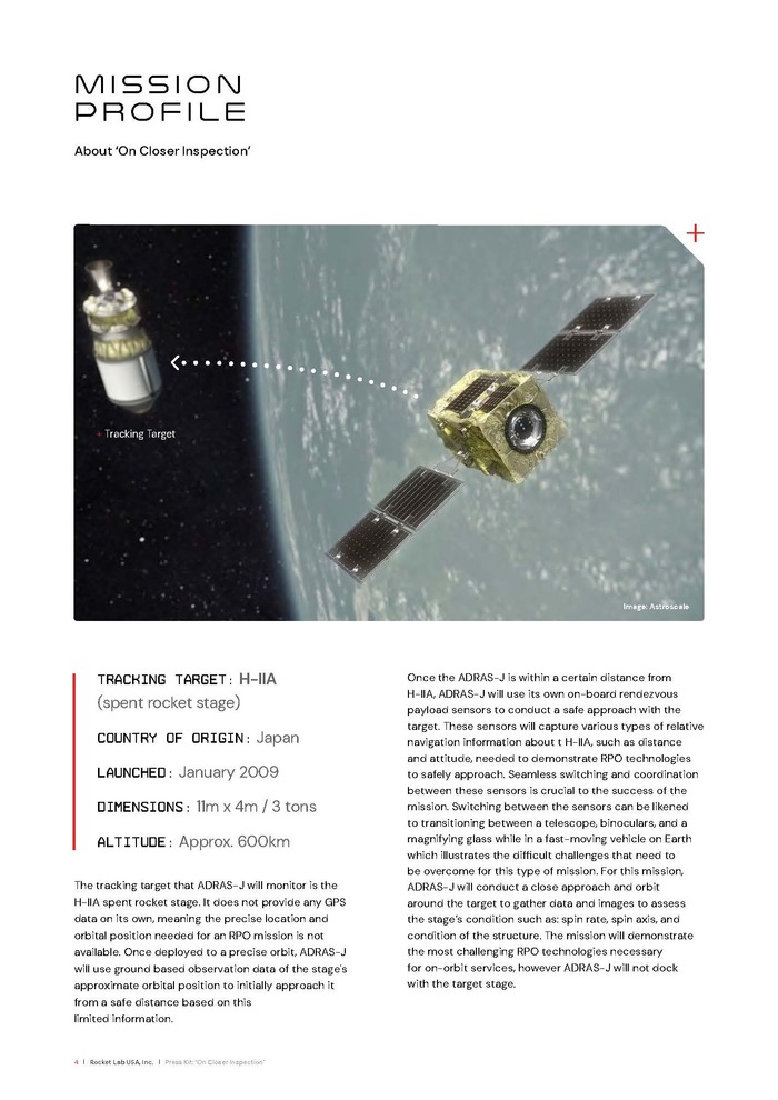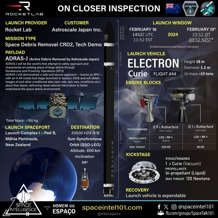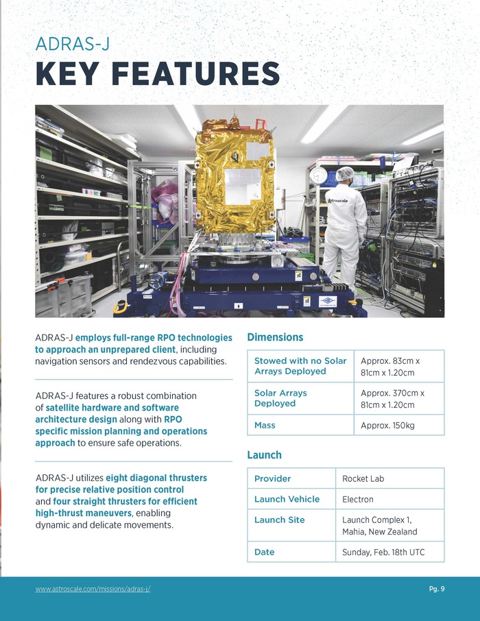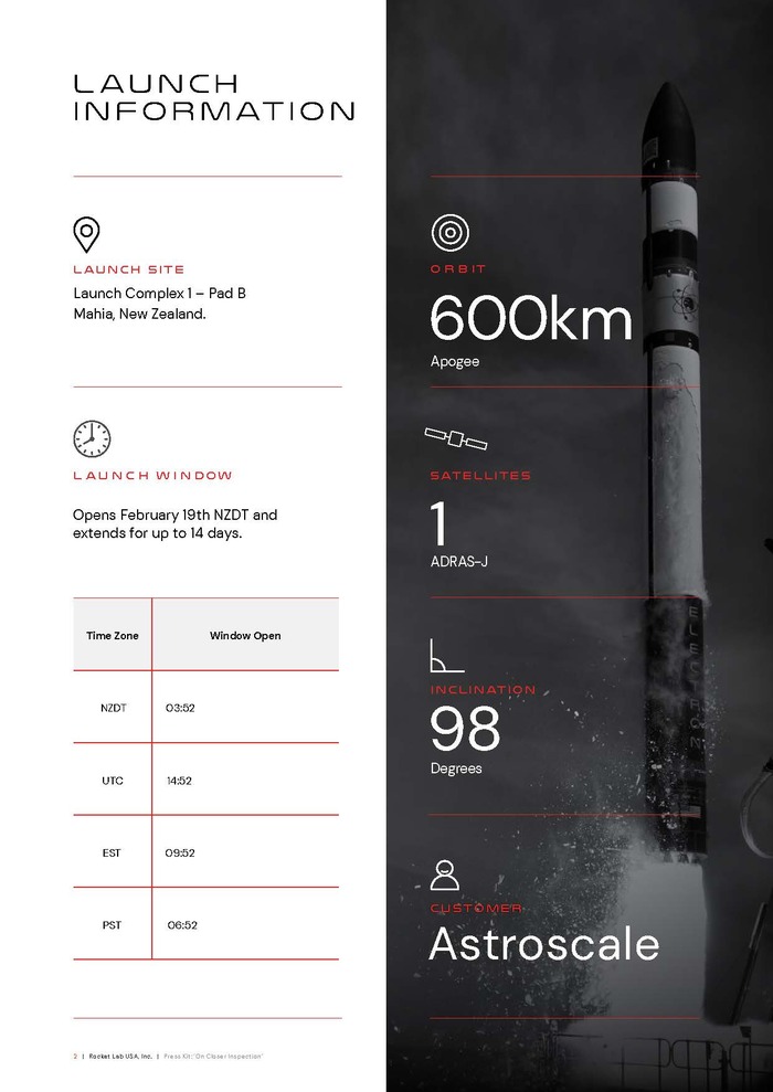 Компания Rocket Lab запустила демонстрационную миссию Astroscale ADRAS-J Electron, которая планирует добиться прогресса в удалении крупномасштабного космического мусора с низкой околоземной орбиты. На этом первом этапе проекта космический аппарат продемонстрирует безопасный и методичный подход к неуправляемому объекту на орбите (верхней ступени ракеты), снимая изображения и другие данные по мере того, как он затем ориентируется вокруг ступени, демонстрируя, что он может сохранять фиксированное положение поблизости.