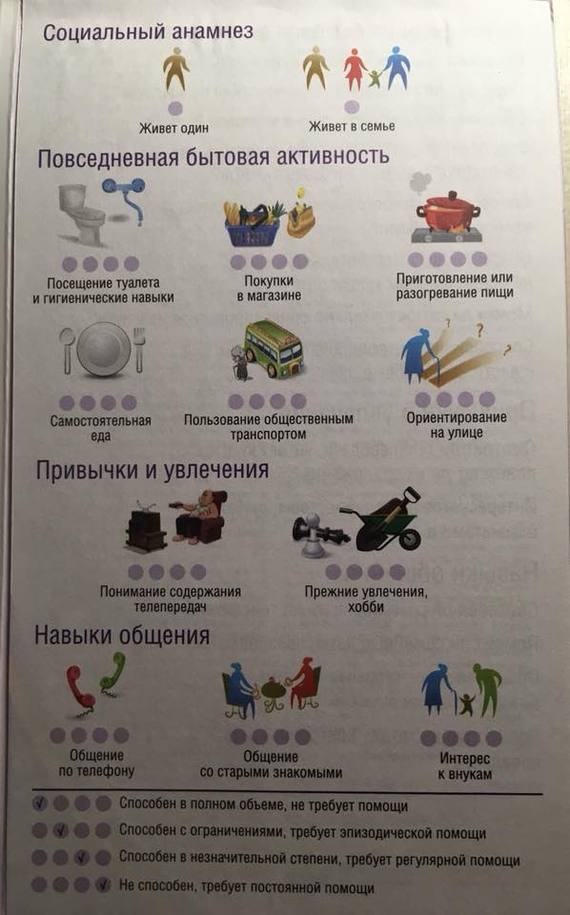 Обычно родственникам задают вопросы про образ жизни пожилого человека. Для упрощения процедуры оценки теперь применяются специальные опросники с использованием графики, например: