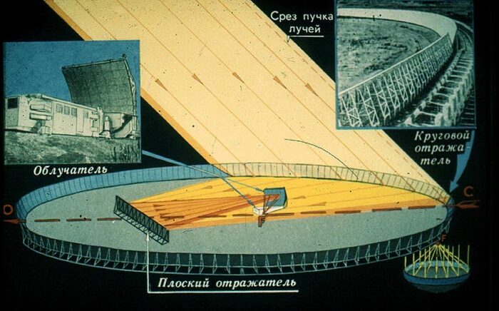 Советские учёные пошли по иному пути. Они придумали оригинальную конструкцию. Учёные не стали создавать гигантское дорогое зеркало. Вместо этого они построили множество небольших зеркал. Своё необычное детище астрономы назвали РАТАН-600. Аббревиатура означает Радиоастрономический Телескоп Академии Наук, цифра 600 – это диаметр получившегося рефлекторного зеркала.