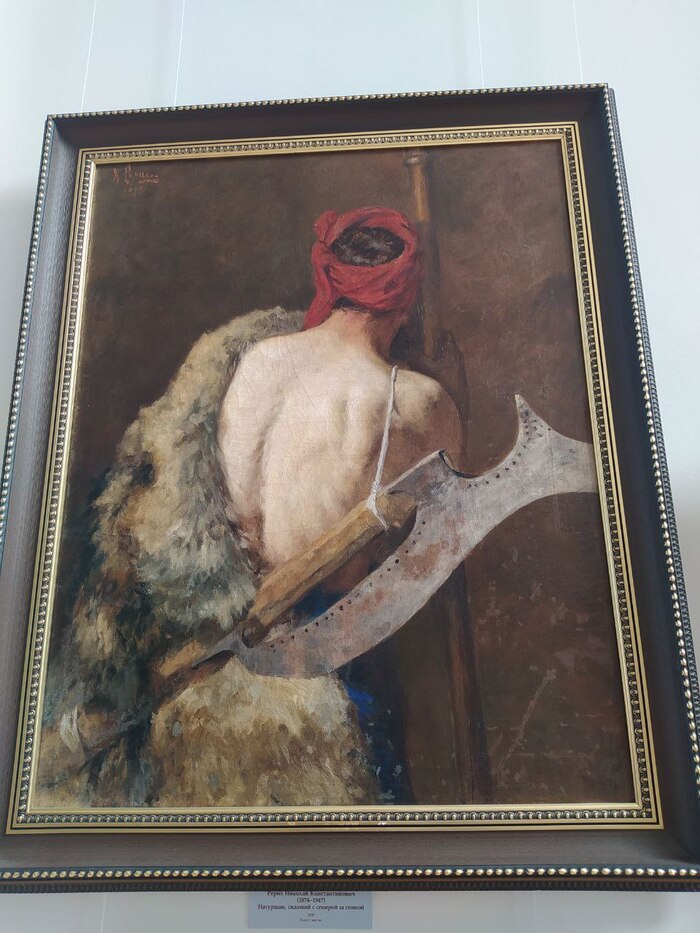 В мастерской художника экспозиция посвящена ученикам Куинджи, среди которых, наверное, самым известный нам теперь Николай Рерих. В музее выставлена картина Рериха "Спина натурщика с секирой". Честно говоря, по характеру живописи это совсем не похоже на знакомый нам рериховский тип живописи.