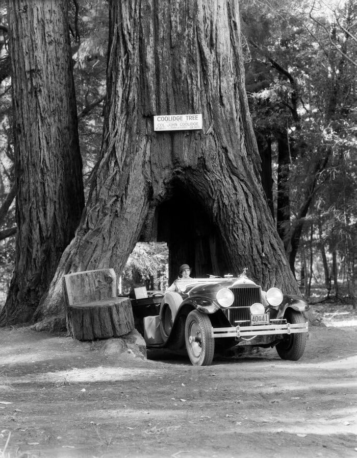 Женщина проезжает через отверстие в стволе гигантской секвойи. США, 1930-е годы. Первая известная попытка прорезать тоннель в стволе секвойи была осуществлена в середине XIX века. Это произошло в рамках развития туризма в Калифорнии после открытия золота в 1848 году. В 1880-х годах был создан знаменитый "Тоннель-дерево" в Йосемитском национальном парке. Этот тоннель был вырезан в живом дереве для того, чтобы туристы могли проходить или ездить верхом на лошадях через его ствол. Однако "Тоннельное дерево" не выдержало времени и упало под тяжестью снега в 1969 году. В XX веке тоннели стали реже вырезать в живых деревьях из-за экологических соображений. Вместо этого часто использовались уже поврежденные или павшие деревья.