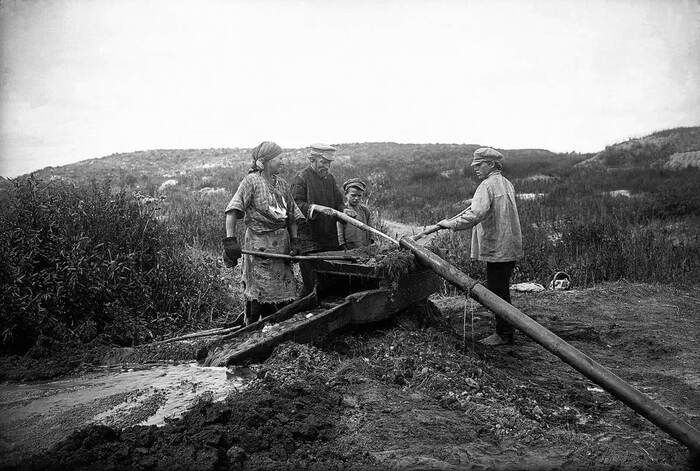 Промывка золота старателями из отвалов, Юльевский прииск, 1926 год.