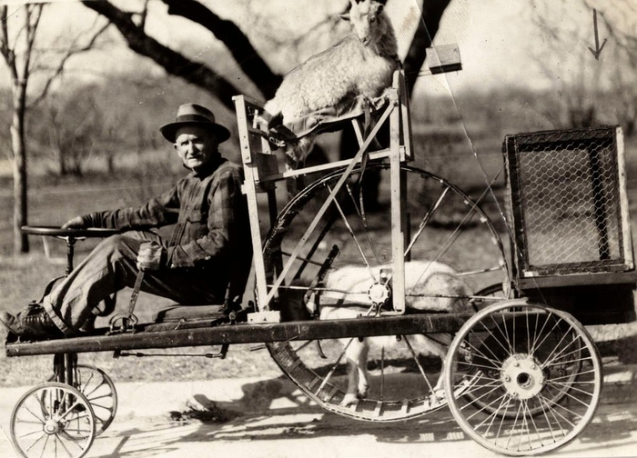 Американский фермер демонстрирует свой козломобиль. Транспортное средство приводится в движение козлом, который находится в беговом колесе. Козломобиль мог достигать скорости до 15 км/ч. США, 1937 год.