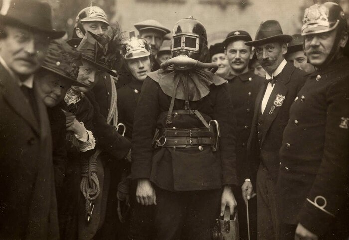 Пожарный с дыхательным аппаратом и в огнестойкой одежде. Голландия, Гаага, 1919 год.