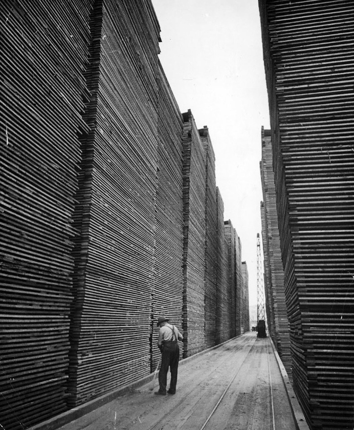 Лесозаготовительный склад Seattle Cedar Lumber Manufacturing Company в Сиэтле, штат Вашингтон 1939 год