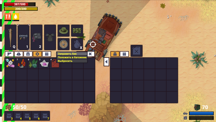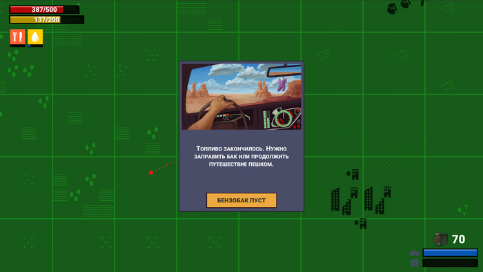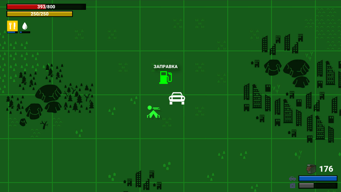 Бензин можно скрафтить и редко найти в мире. Это довольно дефицитный и важный ресурс. Без него машина на глобальной карте не поедет.