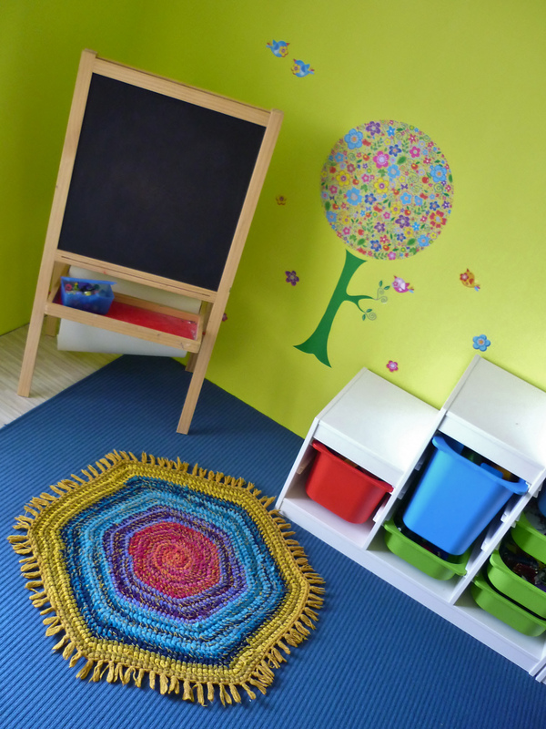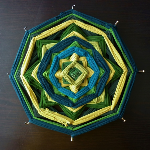 Итак нумер 1. Переработка. В какой то момент жизни мне срочно потребовалось купить в секонде 5кг разноцветных х/б футболок, чтоб подвергнуть оные жестоким экспериментам. Из этого вышел то ли коврик, то ли чехольчик на диван(спицами) и прекрасный бабушкин коврик-мандала(крючком) в прихожую, а из остататков я соткала на брусочках с сотней гвоздиков подушку и накрутила на велосипедные спицы мандалу