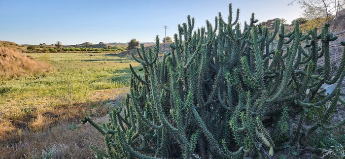 Знакомьтесь: клещевина обыкновенная (Ricinus communis). Здесь, в Испании, она растёт повсеместно — и как декоративное, и как дикорастущее растение.