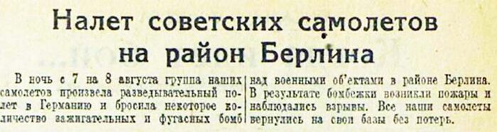 Англичане недоумевали — их самолеты в ту ночь к Большому Берлину даже не приближались, да и погода совершенно не благоприятствовала полетам. Ситуацию прояснила заметка газеты "Правда":