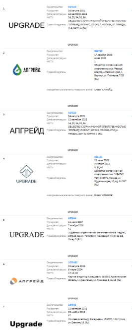 Захотела у нас одна компания зарегистрировать на себя название «UPGRADE». Смотрим в реестры Роспатента — а там кучи таких «UPGRADE» уже есть: