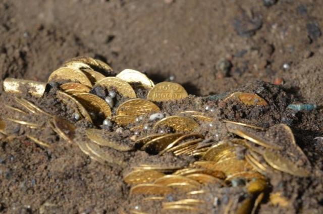 Роберт тут же позвал напарника, строители стали просеивать песок, мелких драгоценностей оказалось очень много! Золотые пуговицы, золотая цепочка, кулон, брошь с камнями, ещё кулон. Всего 45 ювелирных изделий! Под всем этим добром рабочих ждала ещё более удивительная и дорогостоящая находка - целая куча золотых монет 17 века! (за качество фото прошу прощения, на видео все видно четко)