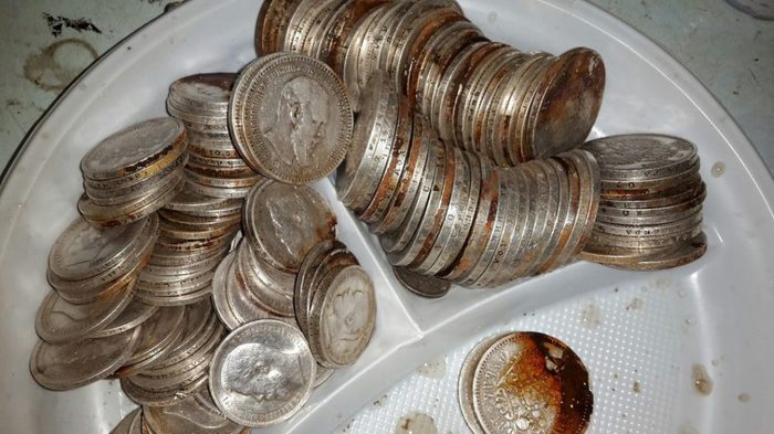 Вернемся на Российские просторы. Этот клад из 200-от серебряных монет был найден еще в 2013 году. Но, только спустя 5 лет везучий копатель решил выложить эти фото в сеть. Со слов поисковика вместе с напарником они гуляли по лесу, собирали эхо войны и случайным образом вышли на деревушку, которая сгинула в октябре 41-го. Место битое не раз, но чем чёрт не шутит.