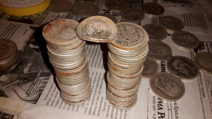 Часть деревни была распахана, кто-то вывез большой слой земли. Как выяснилось позже, в соседнем поселке выравнивали площадку, а грунт отсюда забирали. Землю собрали в том месте, где стоял дом мельника. Кругом чермет и хозяйственное железо. Среди хлама и попался чугунный горшок накрытый старой сковородкой. Рубли и полтинники. У многих состояние просто идеальное! 4 царя, 4 разных эпохи.