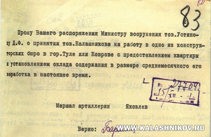 На полигон НИПСВО в подмосковном Щурово Калашников окончательно перебрался в начале 1946 года, где и приступил к работе над автоматом под промежуточный патрон. Осенью того же года, после того, как его конструкция была признана перспективной, молодой оружейник был направлен в Ковров, где должны были изготовить его опытные автоматы. Потом была бесконечная череда тяжелейших испытаний и заслуженная победа в конкурсе.