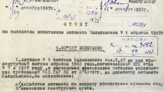 И, да, обозначение «АК-47» в испытательной документации присутствовало. Первое доступное нам упоминание АК-47 датировано маем 1948 года, тогда как в заводском отчёте в декабре 1947 года оружие названо «автомат Калашникова № 1 образца 1947 г.».