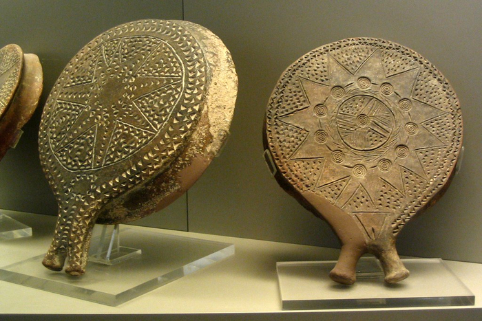 Помимо загадочных фигурок кикладцы делали ещё одни странные предметы, археологи и историки условно называют их "сковородками". Возможно, эти керамические сосуды использовались как зеркала, когда в них наливали воду или полировали до блеска. Возможно, и правда это были сковородки, блинчики жарить. И яичницу. Или что у них там было. Хотя следов жарки на них нет, так что это наименее вероятный сценарий.