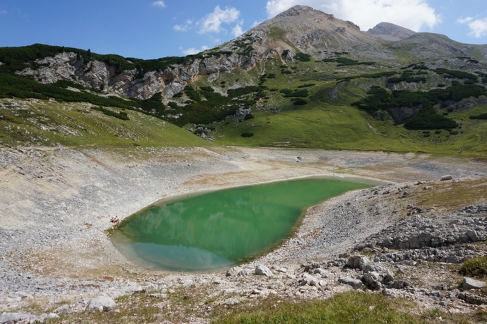 Местами тропа становится трудно проходимой – по ней течет ручей и впадает в небольшой пруд тоже прямо на тропе чуть ниже.