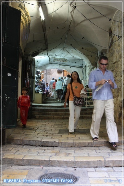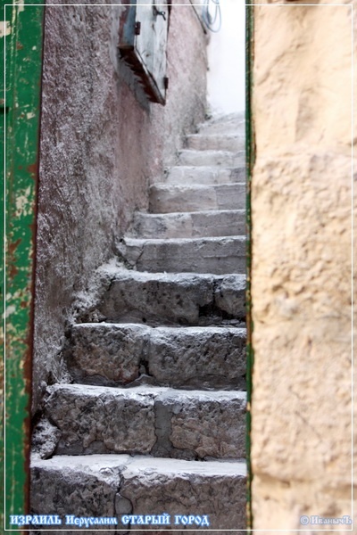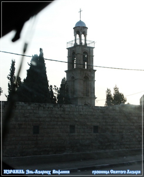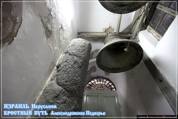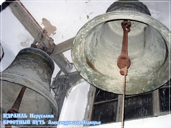 «…За Порогом Судных Врат с востока существует выход на Русскую улицу. Небольшое темное помещение с одним маленьким окном вверху послушно приняло три тайно доставленных из России колокола весом 38, 28 и 5 пудов. Их тащили по ночам на катках женщины из Яффы, чтобыне вызвать подозрений у местных властей. Сейчас колокола молчат в надежде на скорое радостное и светлое время возрождающейся святыни. Иногда они всё-таки подают свой голос, сверяя своё время с действительностью и проверяя надёжность защиты двух древних гранитных колонн, стоящих по бокам «звонницы». Конрад Шик и архимандрит Антонин определили, что колонны являлись когда–то частью пропилеев Воскресенской базилики императора Константина, что требует к ним особого почтения….»
