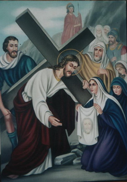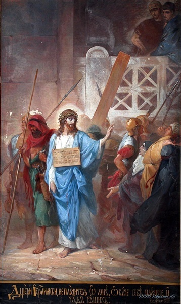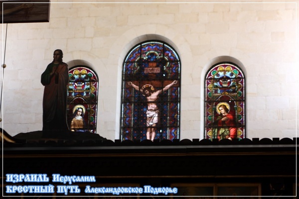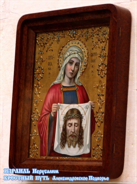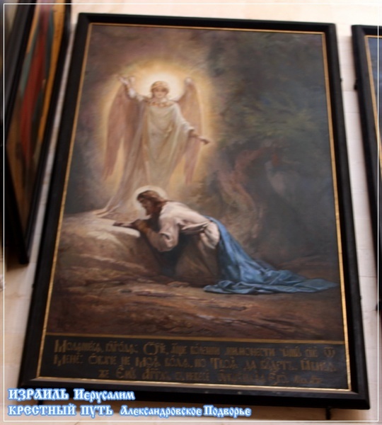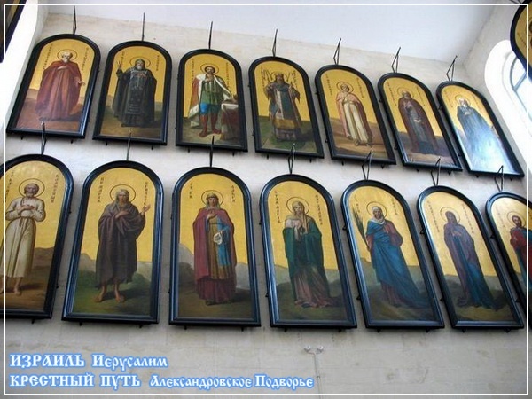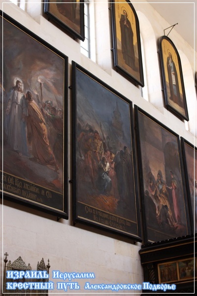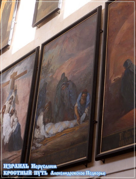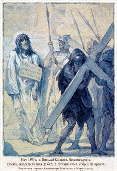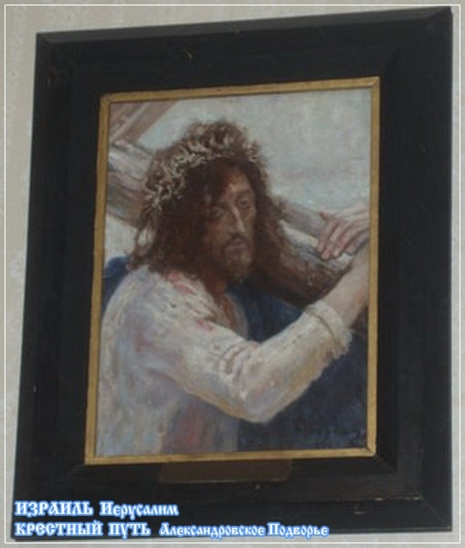 Живописный этюд И. Е. Репина „Несение Креста“, исполненный им в 1898 году, написан во время путешествия по Святой Земледля церкви в честь Святого Благоверного князя Александра Невского на Александровском подворье в Иерусалиме. На его оборотной стороне значится надпись: „Сей образ Несение креста, написанный мною в Иерусалиме приношу в дар Иерусалимской русской церкви „На раскопках“. Желал бы, чтобы образ был заделан под стекло и помещён на левой стороне при пороге Ворот (не высоко). Прошуна литургиях поминать имена моих родителей Евфимия и Татианы. И. Репин 1898 июль 27“.