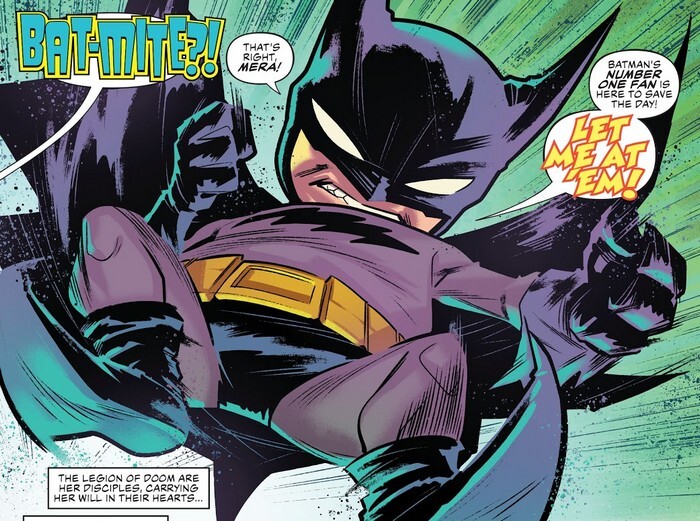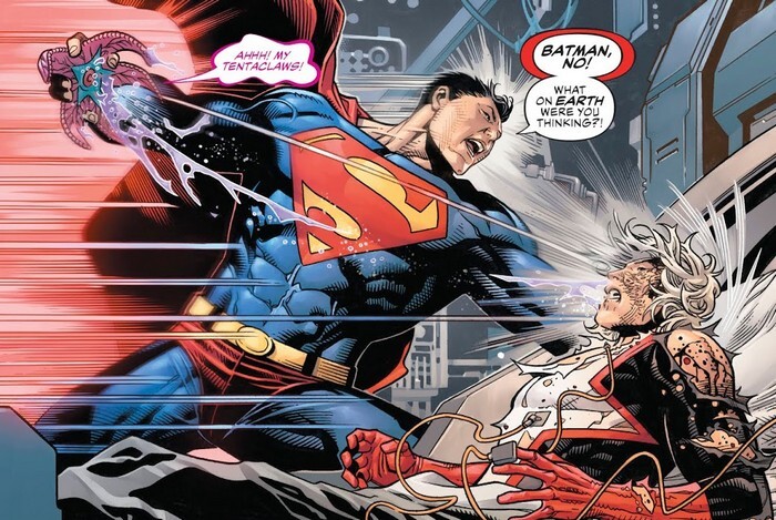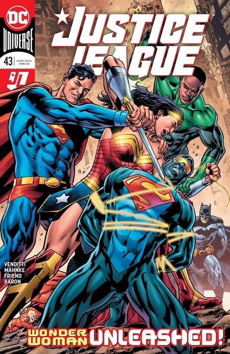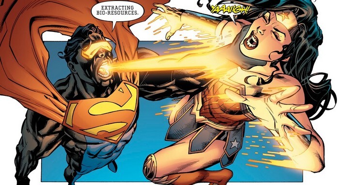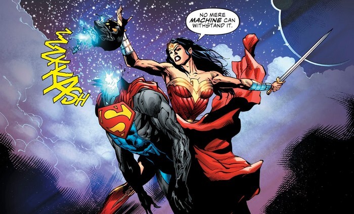Этим потомки займутся (уж как пойдёт) в комиксе Justice League #29. Просыпается Супермэн такой с утреца, выходит на кухню к Лоис – и становится ему плохенько от криптонита! На Человека из Стали нападает Аквамэн из будущего! И он вооружён отнятой у Бэтмэна дубинкой, испускающей красную солнечную радиацию. У Супермэна нет ни шансов! Карри похищает Супермэна, напоследок прописав ББПЕ Лоис, попытавшейся мужа защитить. А Чудо-Женщина возвращается на то место, где сражалась с Кровными – и там её выслеживают потомки героев, и спорят, стоит ли вообще нападать. Это же, блин, Чудо-Женщина! А что если её смерть не изменит будущее? А даже если и изменит, кому хватит силы её убить? Она же практически как Супермэн! Диана, кстати, разговоры потомков слышит, и сдаваться без боя не собирается. Сражаться с ней практически на равных может только Хантер, для него убить мать не зашквар (тем более, мать – не та, кто родила, а та, кто вырастила в любви и заботе).