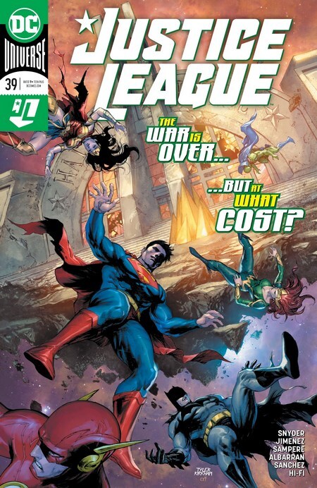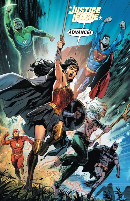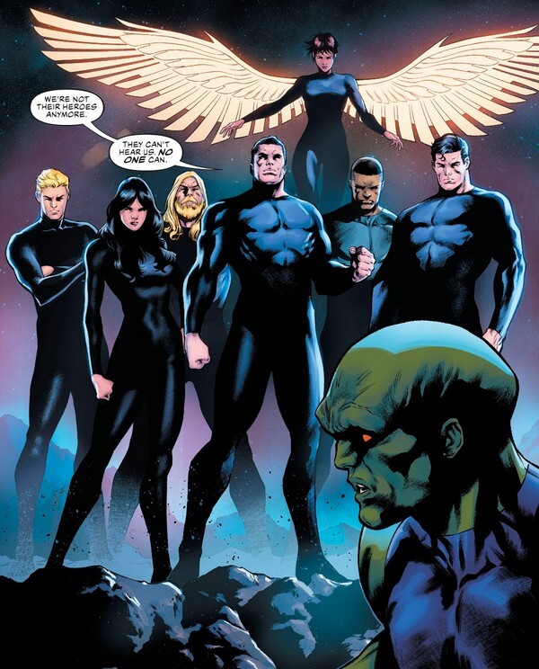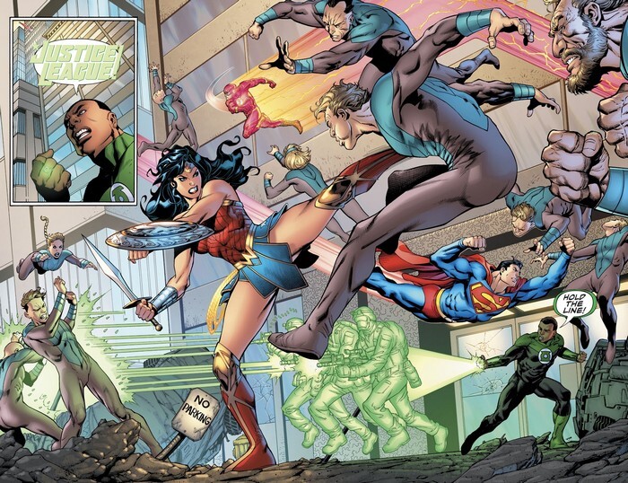А значит, дело за комиксом Justice League #26 от Брайана Хитча и Фернандо Пасарина. Комикс предлагает заглянуть в недалёкое будущее, на двадцать лет перёд. Мир мрачен, города лежат в руинах. Группа странных молодых людей собирается пробраться на Олимп! Да, ту большую гору. Ребята не из простых – самый мускулистый, Хантер, носит плащ Супермэна и Лассо Истины, остальные украшены символами Зелёных Фонарей или Флэша, одна девушка вооружена трезубцем Аквамэна. Внезапно против команды выходит Карри – пожилой бывший Аквамэн, облепленный деталями от Киборга. «Молодёжь, вам эта миссия не по зубам. Думаете, я сделаю вам поблажку, потому что с вами моя дочь? Ха. Проваливайте, и мне не придётся вас убивать!». Молодёжи действительно приходится отступить – оказывается, Карри вооружён «Тёмным Кольцом». Это кольцо по типу колец Чёрных Фонарей, только несколько иное и гораздо более опасное. Отвлекая Карри магией, молодёжь отступает на гору, опасаясь, что скоро прибудет некая Властительница (Sovereign).