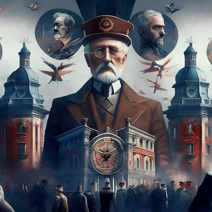 Дмитрий Иванович Менделеев — русский учёный, успешно работавший во многих областях науки, помимо химии. Наиболее известное его открытие – Периодический закон химических элементов / Историческийбагаж.рф & На фоне — изображение создано нейросетью Шедеврум