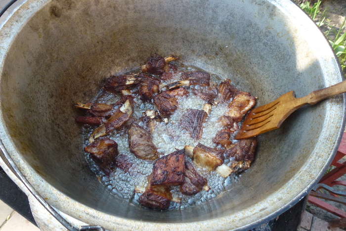 В раскаленное масло опускаю ребра и хорошенько обжариваю. Что ранее обжаривать, лук или мясо, зависит от того, что мы хотим получить по итогу. Если цель-цвет зирвака и плова в дальнейшем, тогда первым обжариваем в масле лук. Важен вкус-сначала обжариваем мясо. Сделать красивый цвет можно куркумой.