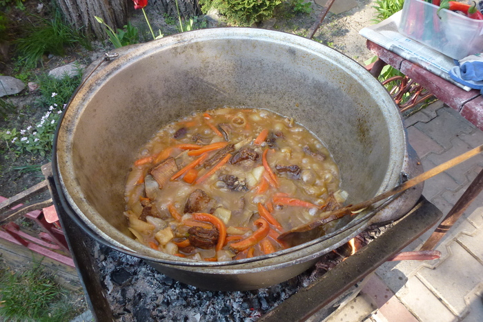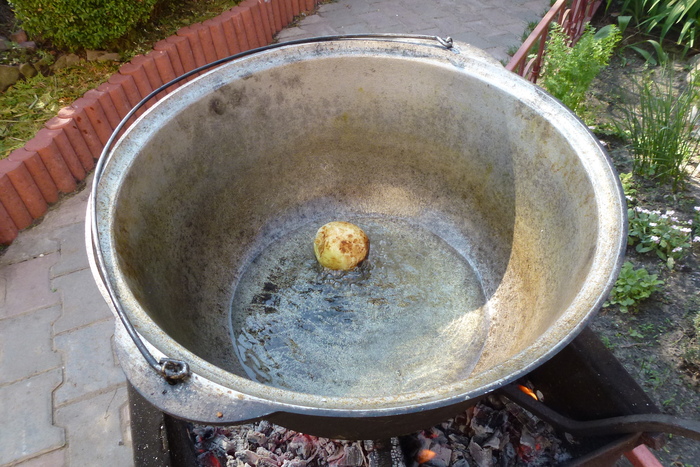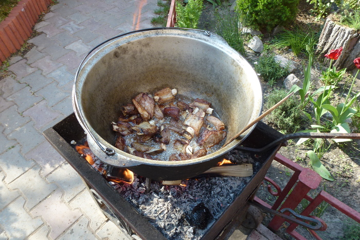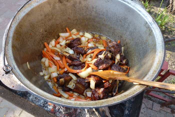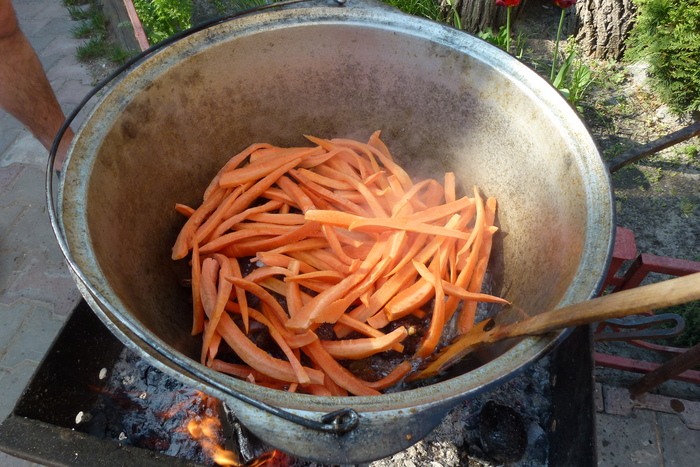 Ставлю казан на огонь. Он у меня алюминиевый. Повидавший виды и пропитанный временем. Исходя из своего опыта могу сказать, что готовить, конечно, на чугунном удобнее. А на вкусовых качествах готового продукта никак это не отражается. По сути, может быть любая посудина, которая равномерно распределяет тепло. Заливаю масло и грею. Масло использую подсолнечное, рафинированное. Еще эту процедуру называют "прокалить масло"- разогреть до появления дыма. Это совершенно не обязательная процедура. Иногда я это делаю. Обычно, для того, что бы для окружающих создать понт, вроде бы я выдерживаю традиции приготовления аутентичного плова. В самом деле, прокаливали масло тогда, когда готовили не на каком то отдельном виде масла/жира, а на смеси масел и жиров, типа зигирь йох (выжимка из смеси льна и кунжута с другими включениями). Так как вплоть до второй половины 20 века не было широко распространено промышленное получение масел, то все масло в быту было домашним, как сейчас бы сказали, нерафинированным. Сейчас же все готовится на рафинированном масле. Которое прошло уже все необходимые стадии для приготовления пищи.