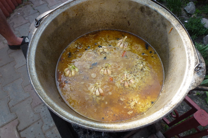 Сливаю воду в которой стоял рис. Время зиры, барбариса и куркумы. Рис закладываю в зирвак, доливаю воды, что бы было выше уровня на пару сантиметров. Чеснок очищенными головками вставляю в рис, что бы были полностью погружены. Казан быстро довожу до кипения. В процессе кипения жир, носитель запахов и аромата, всплывает вверх и пропитывает рис. Затем рис по мере приготовления и разбухания начинает втягивать в себя воду и жир, набирая вкус.