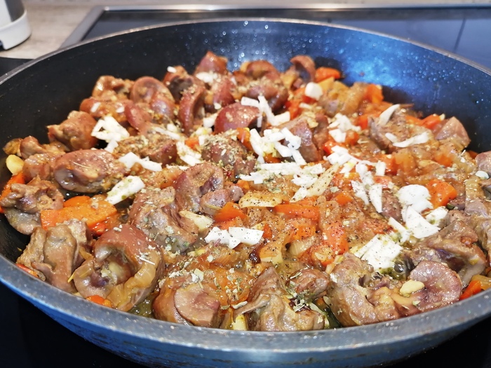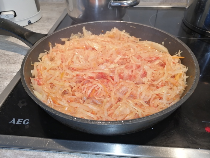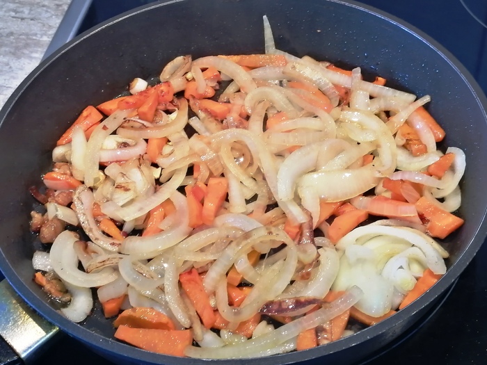После обжарки моркови добавляю лук. Здесь я сделаю небольшое отступление. Я добавил лук после моркови. Адепты же считают, что лук должен быть рядом с мясом. Лично в моем случае с пловом, считаю, что я делаю все правильно. Хотя, не буду утверждать, что так делать нужно всем. Так обжаривать морковь, т.е. до лука, лучше получается. Так и делаю.