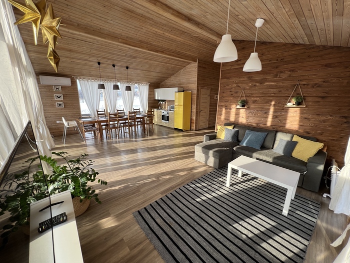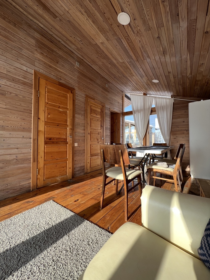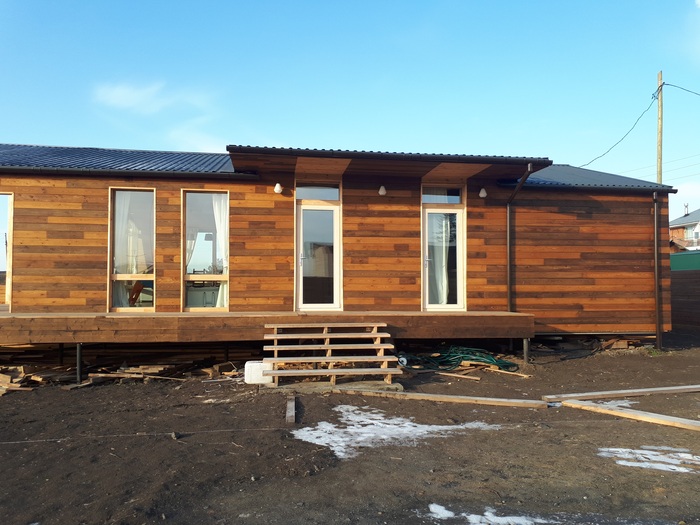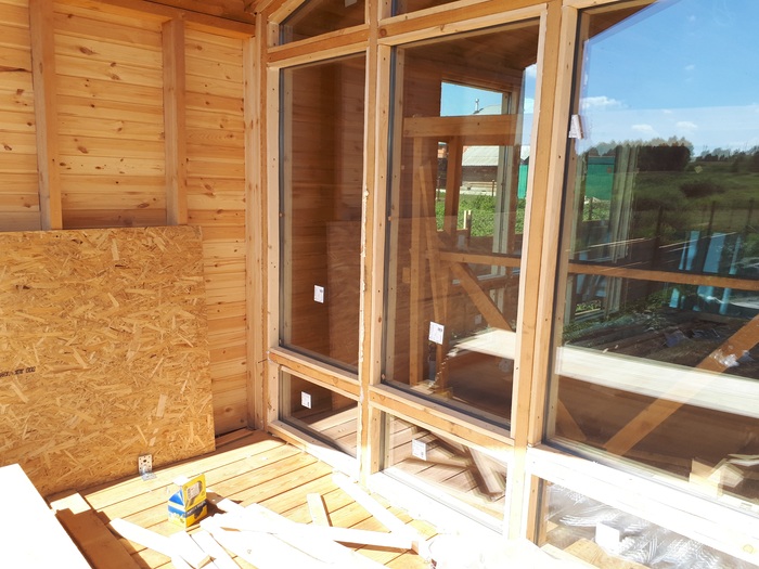 Мне казалось, что до НГ еще 3 месяца и мы успеем все достроить и сделать внутреннюю отделку. Новый год- это самое рыбное время для посуточников, можно за 10 дней двухмесячную норму сделать, поэтому я торопился. Только бронировать новогодние праздники начинают уже в октябре и если возьмешь деньги, не успеть подготовиться чревато большим скандалом. Мне, помимо работ по возведению каркаса, надо было организовать монтаж электричества, водопровода, отопления, теплого пола, залить стяжку на всех этажах. найти, кто будет делать отделку, купить и собрать всю мебель. технику, посуду и белье на 16 чел. для 8-ми комнатного дома. Плюс сделать баню. Тогда мне казалось все абсолютно реальным. Ну начали делать, Не буду углубляться в детали, все шло нормально, каркас закончили, я нанял 4 узбеков они начали отделку делать. Но газа не было, грели электропушками, а там все работы с водой- кафель, шпаклевка, покраска стен. Зима еще лютая была, везде запотевание, сосульки. Я туда каждый день практически ездил, террасу сам делал, без нее в баню не зайти было. Доски сам строгал электрорубанком, экономили уже на всем.