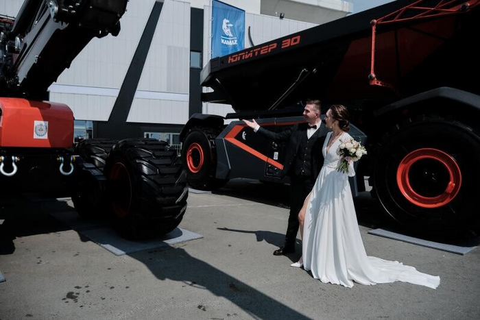 Блок развития подхватил и перевел на постоянные рельсы инициативу главного специалиста кабин и дизайна службы главного конструктора инновационных автомобилей Семена Фараносова. Молодой человек воспользовался тем, что даты его свадьбы и очередной выставки «Иннопром» примерно совпадали, и выбрал выставку перспективных автомобилей КАМАЗ темой своего праздника. Оценив идею, руководство блока развития решило развить ее в традицию, если будет на то желание коллег. Опытные образцы на производстве выставлены практически всегда – нужно лишь исключить из кадра те, которые представляют коммерческую тайну. Как рассказал "Вестям КАМАЗа" Фараносов, тему фотосессии для них с невестой определили обстоятельства. Перед свадьбой они с Марией затруднялись с выбором места проведения церемонии: молодые люди жили в Набережных Челнах, а родня - преимущественно в Екатеринбурге. Новость о проведении «Иннопрома» в уральской столице в подходящие дни помогла решить вопрос. Поскольку Фараносов лично руководил командой, которая разрабатывала дизайн выставленных автомобилей, будущая семья решила, что такой антураж будет достаточно символичным для начала совместной жизни.