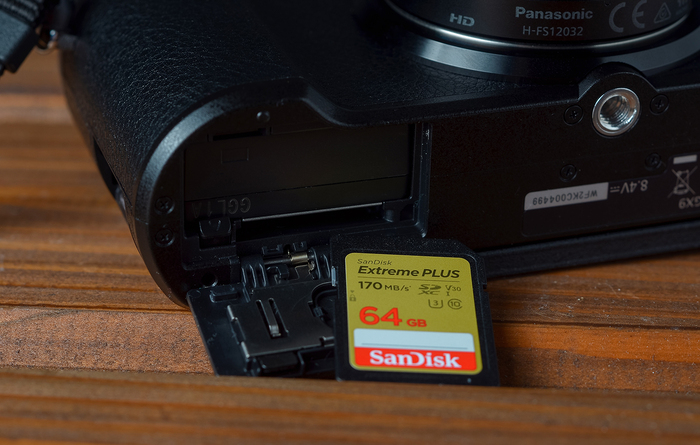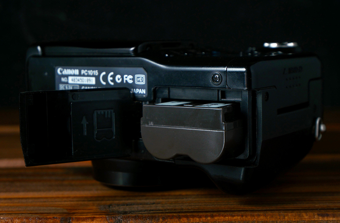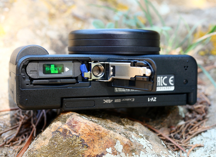 Снизу батарейный блок, совмещенный с гнездом для карты памяти, штативное гнездо, металлическое. Батарейка садится достаточно быстро, но может быть от того, что я часто включал и отключал камеру, а ведь при этом гоняются линзы объектива, что тратит заряд. Можете отписать в комментариях, на сколько кадров у вас хватает одной батареи.