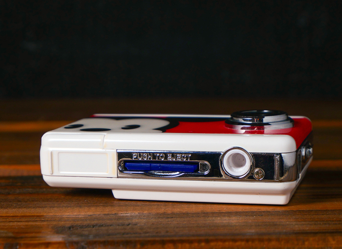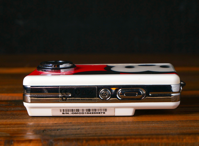 На передней части из важных элементов рожица Микки Мауса и объектив, объектив фиксированный, ничего не двигается, вокруг него, на кольце имеются надписи 4X DIGITAL ZOOM F/3.0 f=8.25mm, такие дела..
