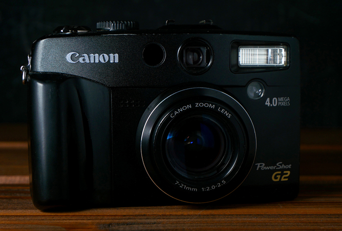 Canon PowerShot G2- это брутальный цифровичок, выпущенный в 2001 году, размеры корпуса 121 x 77 x 64 мм, вес с батареей 510г. В камере установлена 1/1,8" CCD-матрица на 4мп, максимальный размер снимка 2272 x 1704, можно производить съёмку как в JPEG, так и в RAW. Передняя вставка корпуса выполнена из магниевого сплава, а задняя часть из ударопрочного пластика. Фотоаппарат не то чтобы сильно компактный. Мой образец несколько потрёпан, но это только придаёт ему солидности)