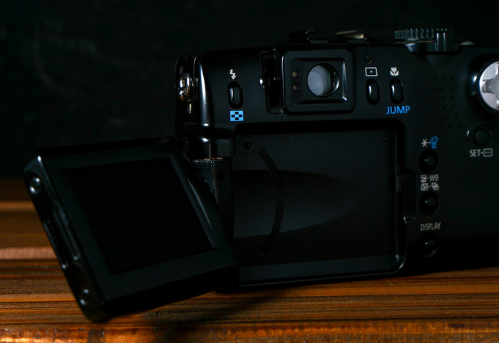 На задней стороне есть экран, внезапно, да?гг Привычные кнопки управления и мрачный переключатель режима съёмки Авто-Фото-Видео. Экран нормальный, 2.7дюйма, 230 000 точек. Процессор в камере DIGIC DV IV, съёмка и запись файлов не слишком долгая, всё хорошо.