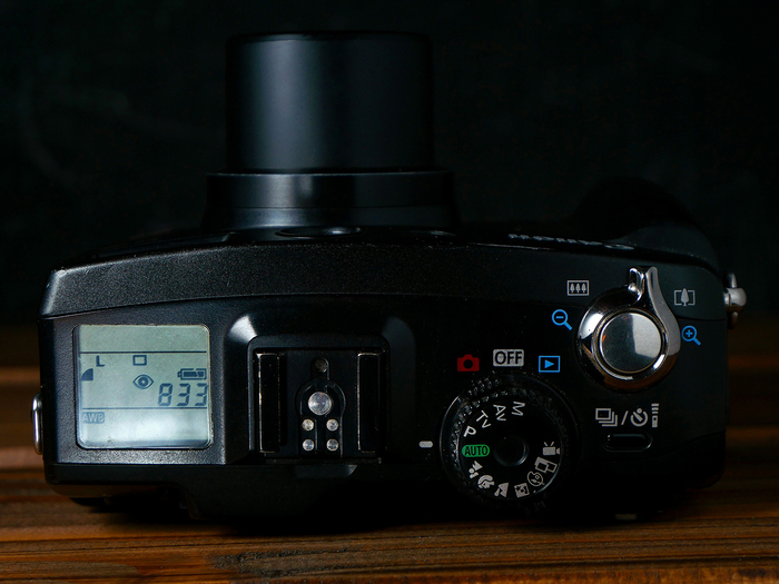 Сверху расположен монохромный экран, на который выводится полезная информация: состояние батареи, диафрагма, выдержка и так далее. Здесь же горячий башмак, (ставь два лайка и подключим к нему моноблок для извращённых фотографических забав), рядом колесо выбора режима съёмки, на котором есть нужные Приоритет диафрагмы (Av) и Ручной режим (M), данное колесо совмещено с рычагом включения камеры и перехода в режим просмотра отснятого. Здесь же кнопка спуска, вокруг которой находится рыжачок управления зумом, и кнопка выбора серийной съёмки, таймера.
