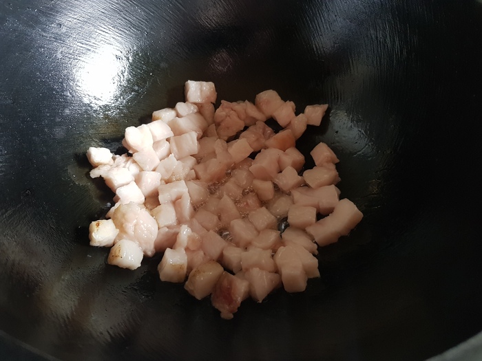 Затем определяем туда нарезанное кубиками мясо. В моём случае это была свинина (да да да, я знаю что свинина не халяль, но мне на это фиолетово), на этом этапе я еще и солю: