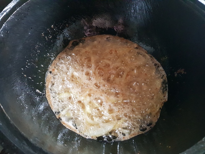 А в казан кидаем лук и обжариваем до золотистого цвета: