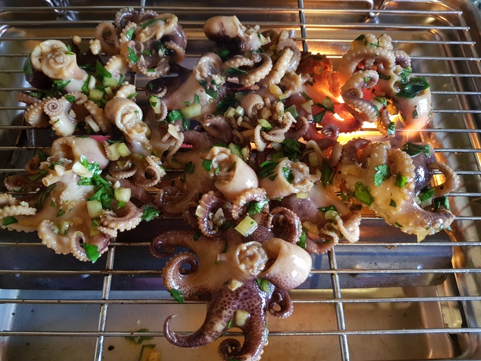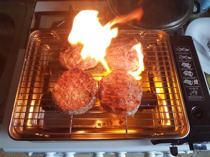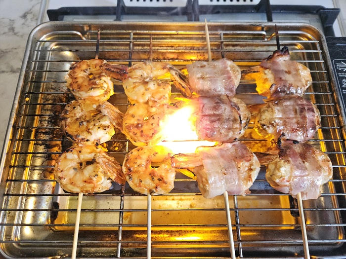 Опосля половину заворачиваем в бекон и всё на шпажки, предварительно вымоченные в воде. На плиту кладем что-то плоское (у меня лист двп), сверху газовый гриль с алиэкспресс, врубаем вытяжку на максимум и выкладываем креветки.