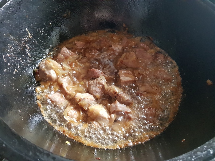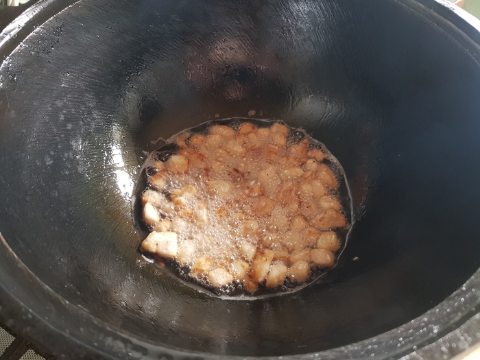 Итак, ставим казан на плиту, делаем максимально возможный огонь, вкидываем нарезанный кубиками курдюк и вытапливаем жирок: