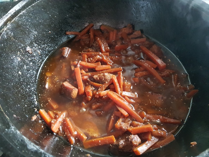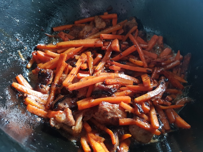 После мяса закидываем нарезанную брусочками морковь, обжариваем, заливаем горячей водой (готовил более менее аутентичный плов впервые, поэтому дозировки не подскажу, лил на выпуклый морской глаз) и оставляем минут на 40 на медленном огне под крышкой: