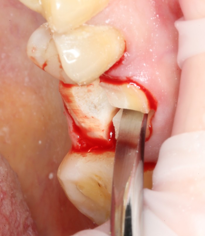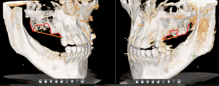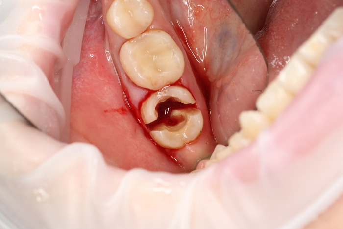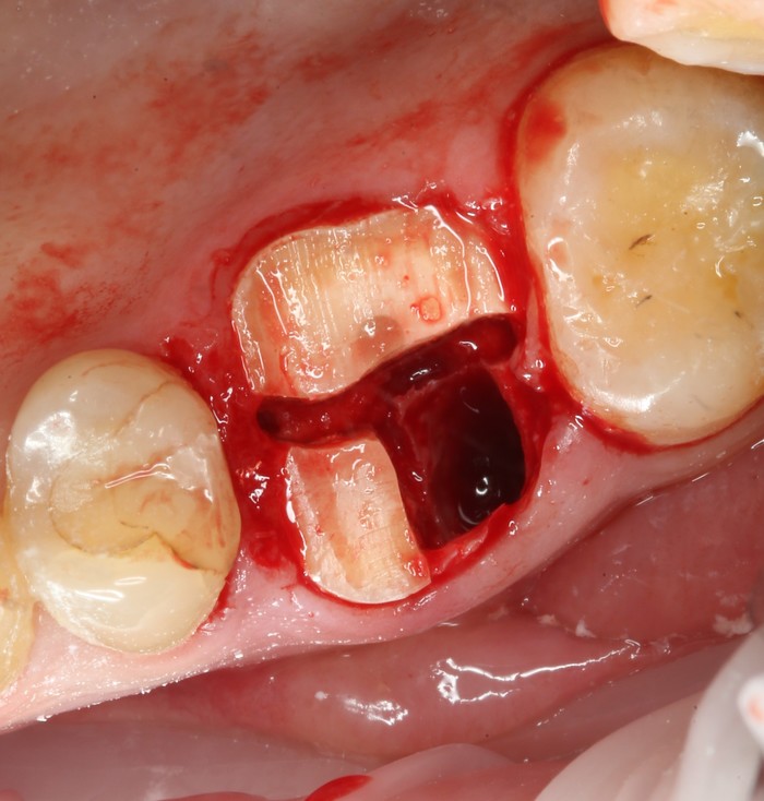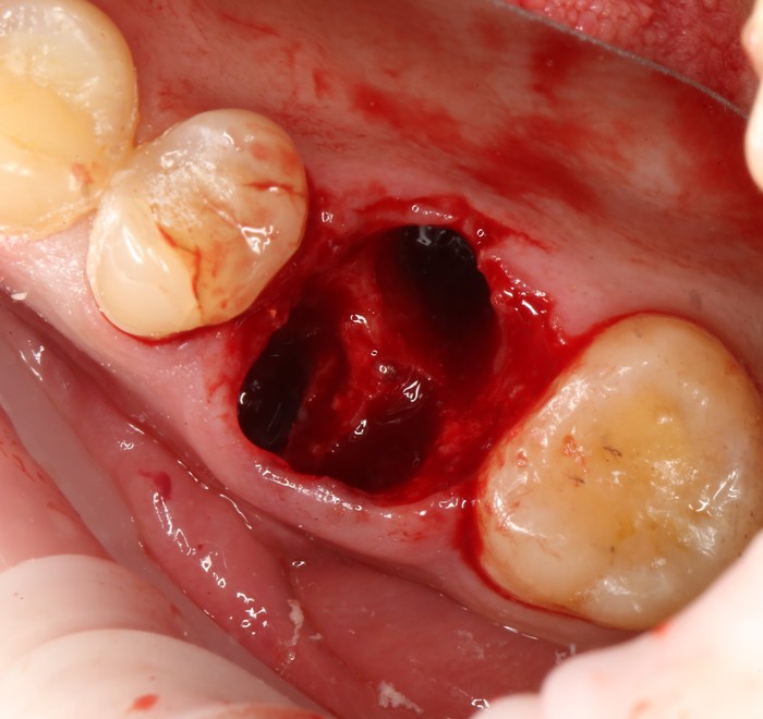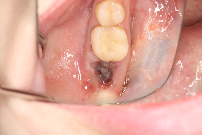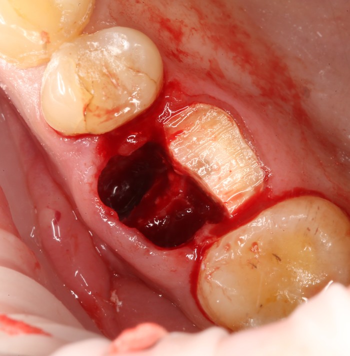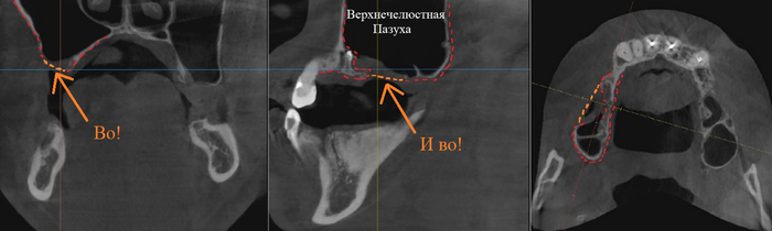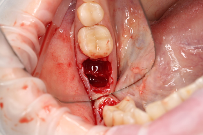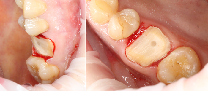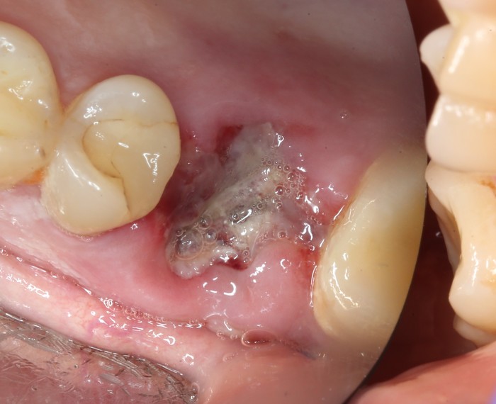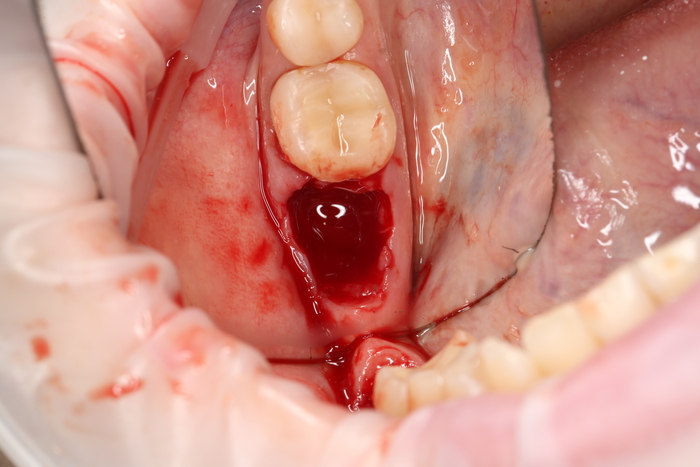 Был взят трансплантат в области бугра верхней челюсти (это то место, где раньше был зуб мудрости).