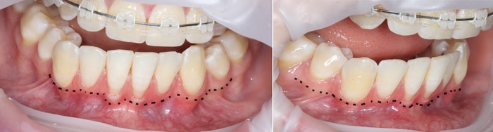 Поэтому, до тех пор, пока есть причина в виде этой самой перегрузки – делать пластику рецессий бессмысленно. Могу вас понять, в интОрнете вы видите красивые картиночки, где корни зубов оголены на половину, все вкривь да вкось, а какой-то «гуру» провел пластику десны, и вуаля – все прекрасно и эстетично. Только вот незадача, самый отсроченный результат, как правило, – это момент снятия швов. Подчеркну – я не говорю о том, что проводить пластику десны бессмысленно и ненужно. Я говорю о том, что сначала необходимо избавиться от причины их возникновения. В противном случае со временем рецессии появятся снова.