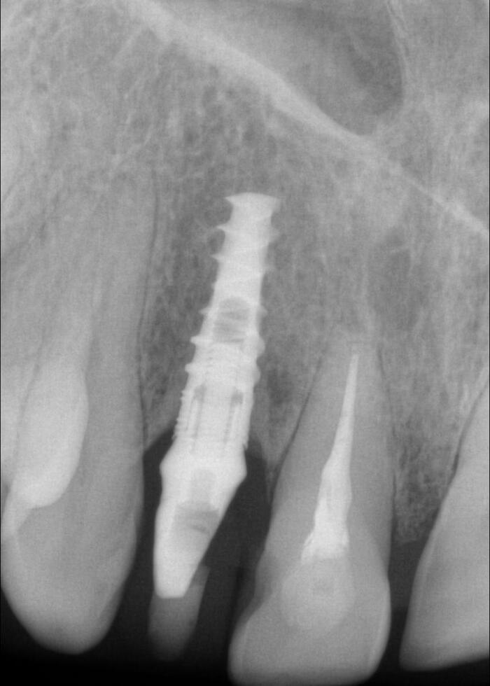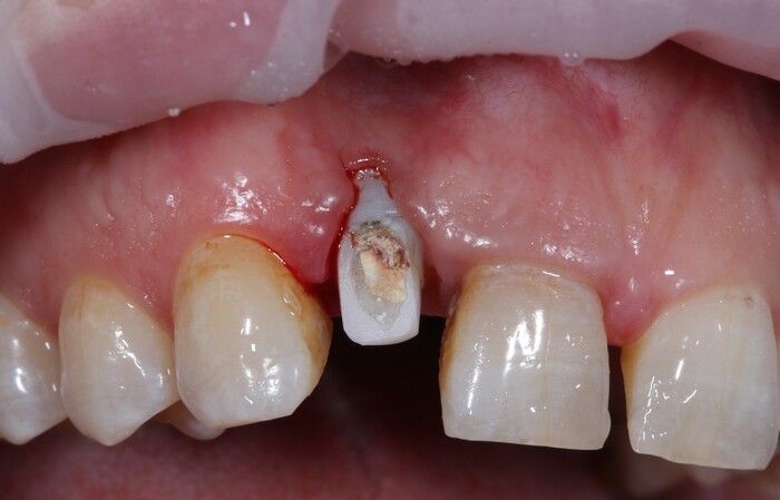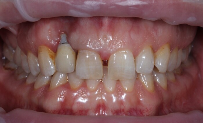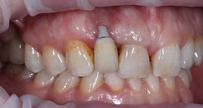 Но мне повезло, ко мне на прием пришла прекрасная девушка (а не усатый господин в плаще на голое тело) с ужасной, с ее слов, проблемой. Когда-то давно ей поставили имплантат в области верхнего бокового резца, но в связи с тем, что положение имплантата было неправильным, а одномоментно с имплантацией пластики десны не проводилось, последняя начала постепенно «подниматься», оголился абатмент (та часть, «за которую держится коронка»). Со слов пациентки, тем же доктором была предпринята попытка сделать пластику десны, не снимая этой коронки. Но, увы, развился некроз, что только усугубило ситуацию.