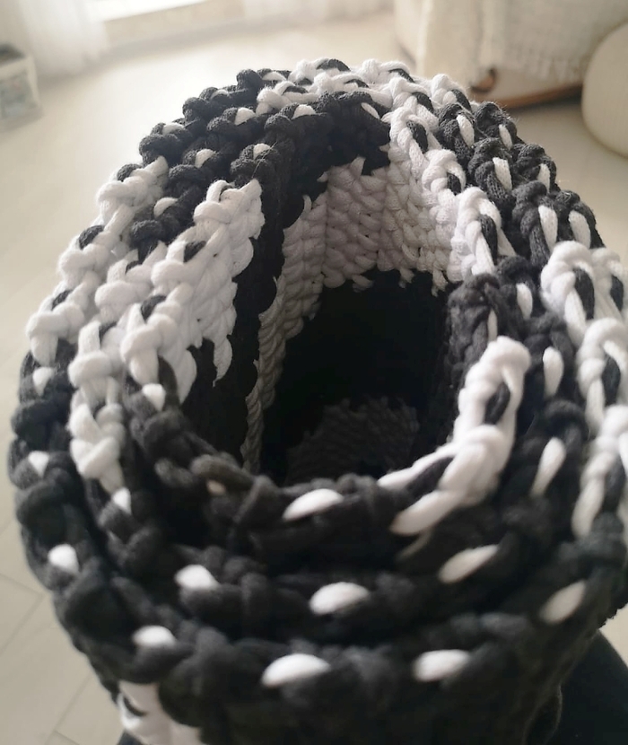 Изготовлен из натуральных материалов: х/ б шнур 4 мм, вязался крючком №7. Цвет: бело - графитовый.