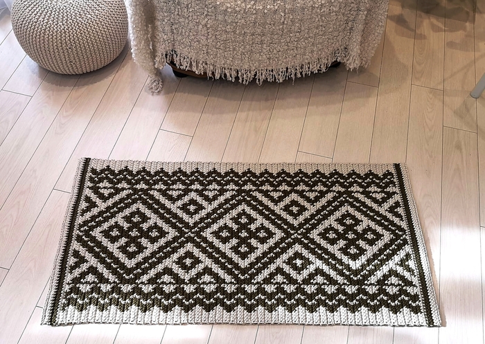 Вязанные ковры приносят атмосферу уюта в интерьер. Также необходимо отметить, что материал гипоаллергенный. Ухаживать легко.