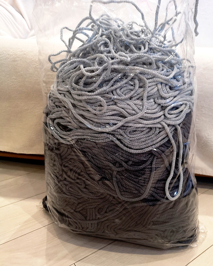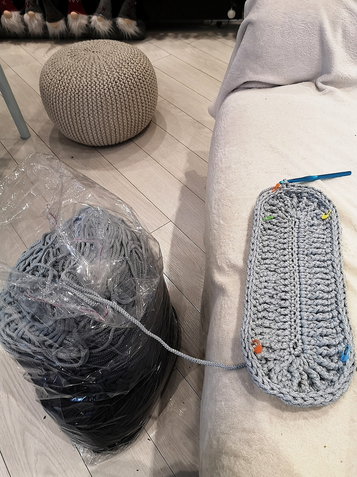 Было связано два пуфа из одного материала, но разного размера. Для пуфа размером 47*30 ушло 300м х/б шнура.